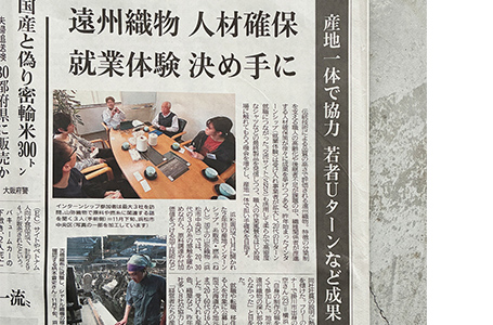 11月に開催された3泊4日のインターンシップ「遠州のトビラ」が、12/2付の静岡新聞に取り上げられました。全国から集まった参加者が遠州産地の織物事業者で就業体験を行うこの取り組みは、昨年に続き2回目の開催となり、今年は16名の参加者を8社の事業所が受け入れました。産地全体で人材育成に取り組む姿勢が、徐々に成果を挙げつつあることが誌面でも紹介されています。